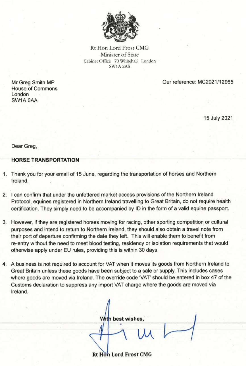 Lord Frost who is the UK's chief negotiator surrounding the Northern Ireland Protocol wrote to our local MP Greg Smith following a meeting between ourselves to summarise three key areas of transport from Northern Ireland to Great Britain, to ensure the legality of what is commonly referred to as "The Belfast Loophole".